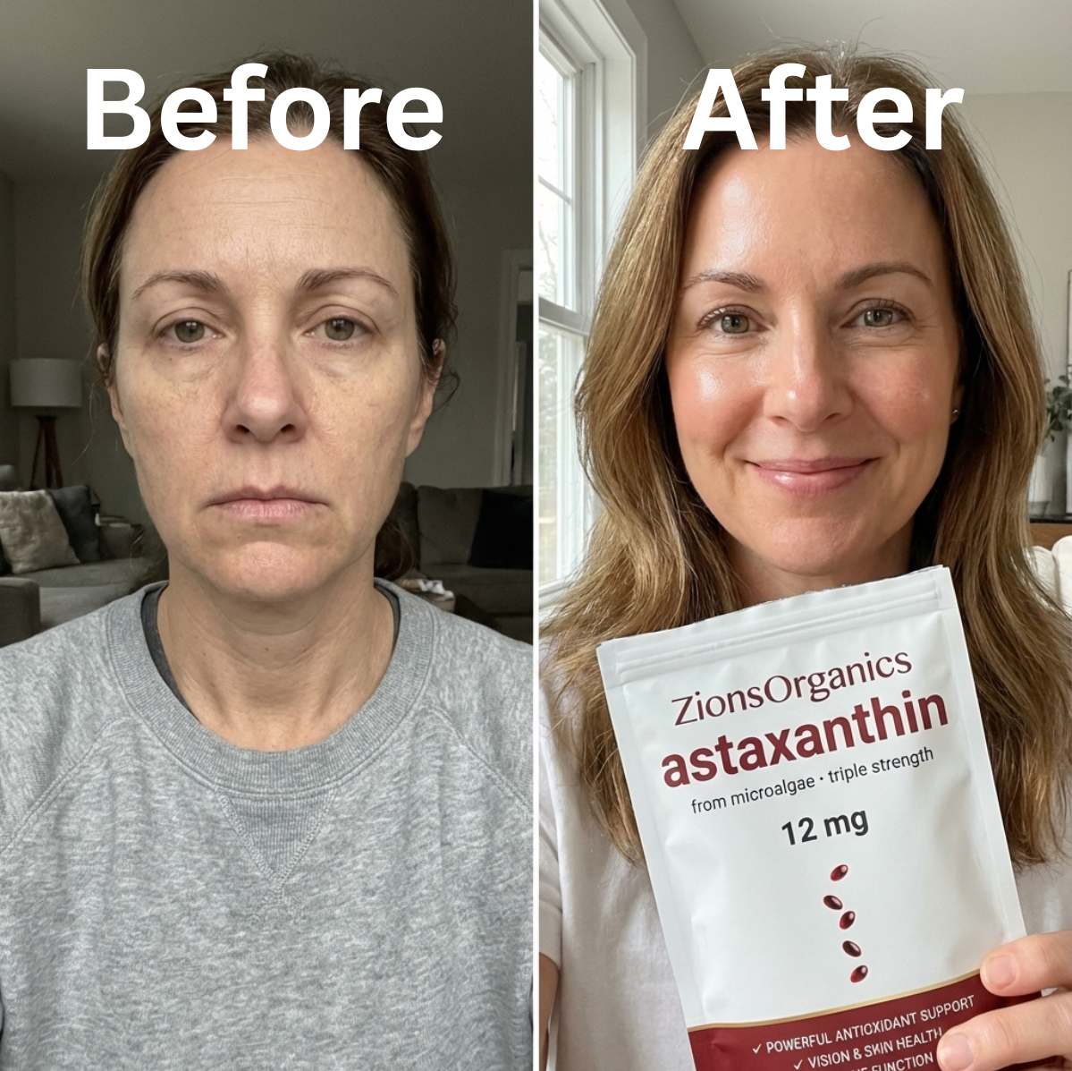 Astaxanthin delivers real results, tightening your skin, improving it's firmness and elasticity, boosting collagen and reversing years of age off skin.